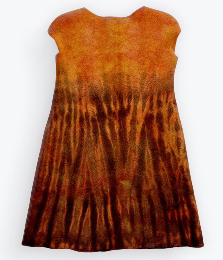 This dress, meticulously hand felted from superfine Merino wool and mulberry silk, is lined with delicate Magellan silk for a luxurious finish. Its hand dyed design showcases a vibrant array of autumnal hues, capturing the essence of a forest in full seasonal transformation. With every brush of color mimicking the warm, earthy tones of falling leaves and dappled sunlight, this piece embodies the raw beauty of nature in its most enchanting phase.