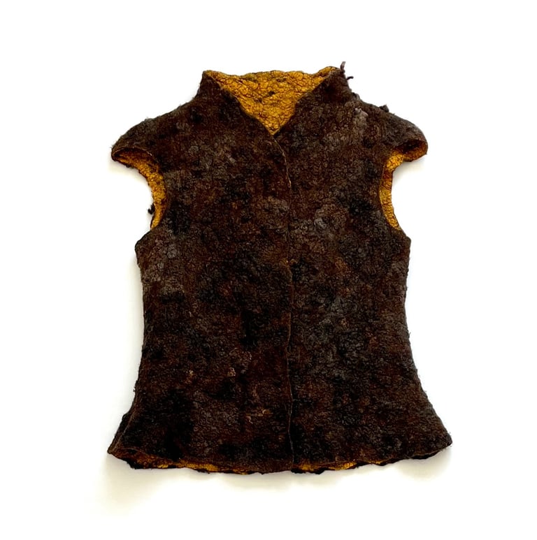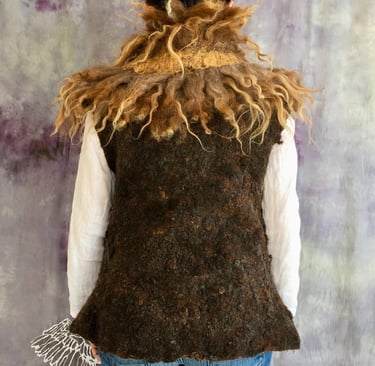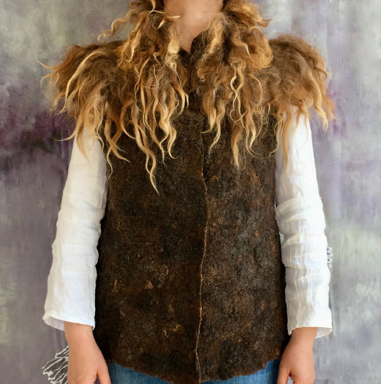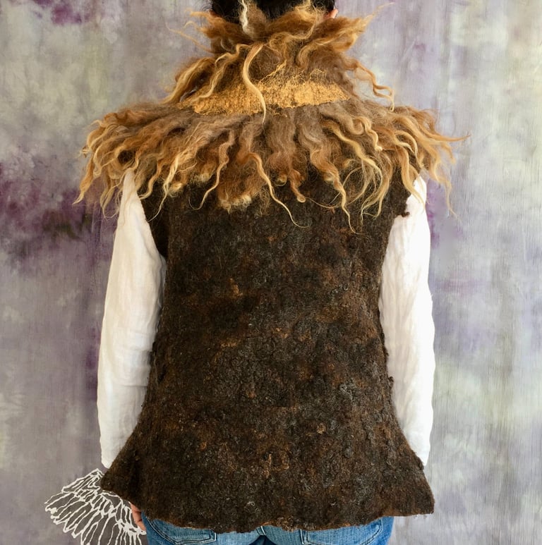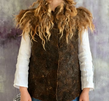 This handcrafted vest is made from the natural colored fibers of Merino crossbreed and Romney fleece, lined with luxurious sari silk for a soft, elegant feel. The front features a sleek snap button closure, while the removable felted fur collar adds a versatile touch of warmth and style. The blend of rich textures and earthy tones captures the subtle glow of chestnut, making this piece both practical and beautifully unique.