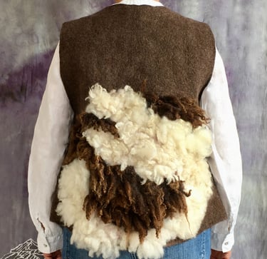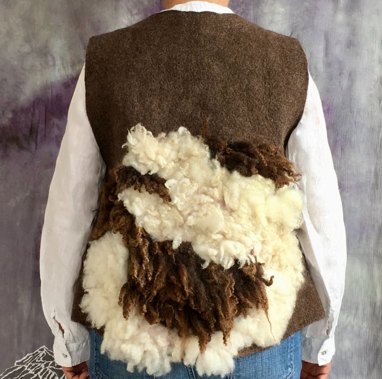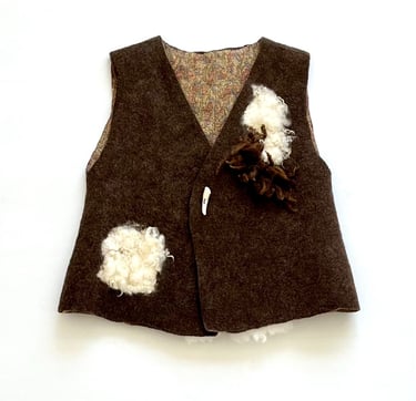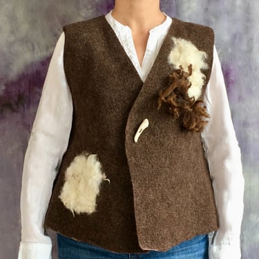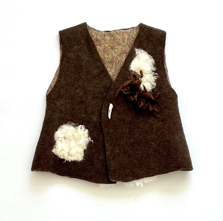 This unique vest is hand felted from a rich blend of wool fibers and fleece from Merino crossbreed and Dorset/Cotswold sheep, offering exceptional warmth and a distinctive texture. The front features a snap button closure, elegantly accentuated by a single antler button that adds a rustic charm. Lined with sari silk fabric, this vest seamlessly combines style and comfort.