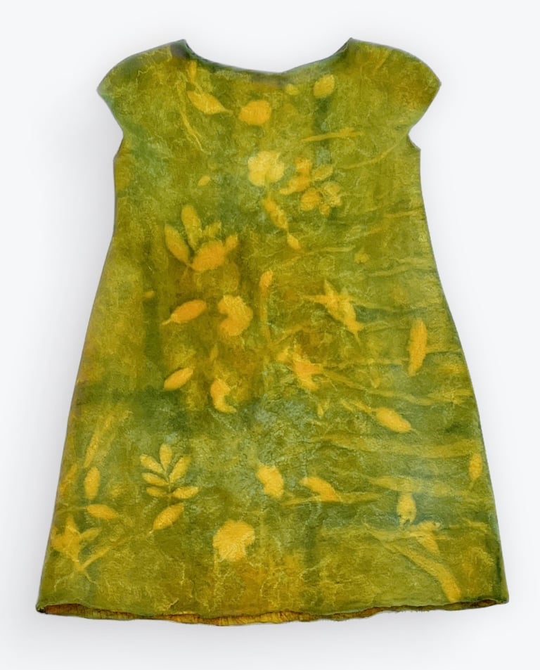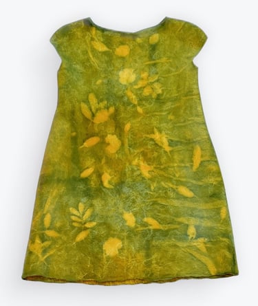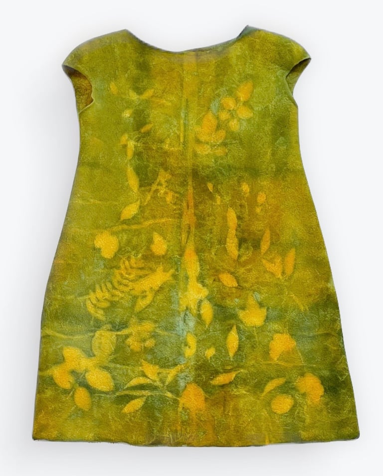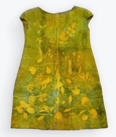 This dress is hand felted using superfine Merino wool and luxurious mulberry silk, lined with Sari silk for added elegance. Hand dyed with care, the dress features unique, nature inspired patterns created using various plant leaves as resist. The rich emerald hues and organic textures evoke the serenity of a lush grove, blending artisanal craftsmanship with the beauty of the natural world.