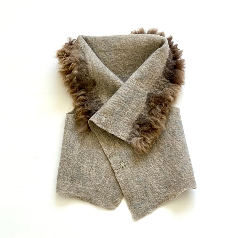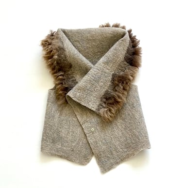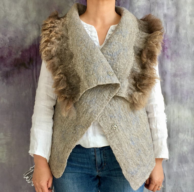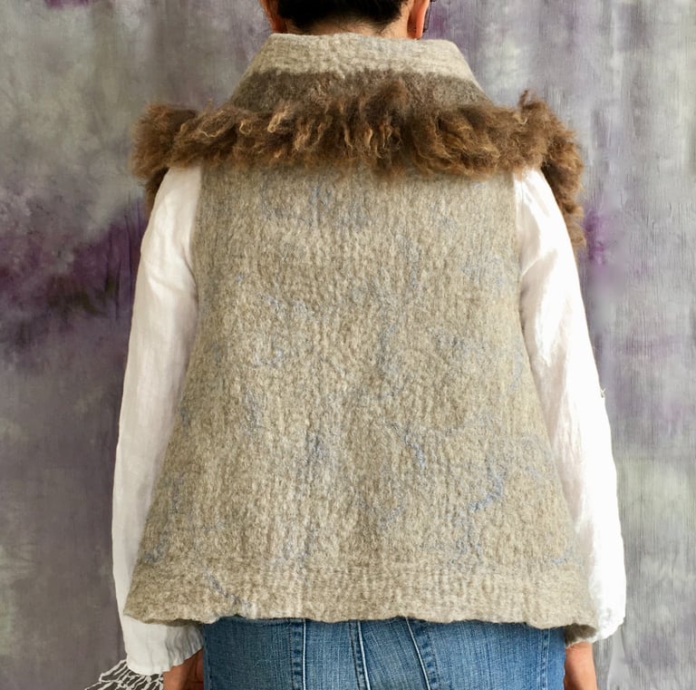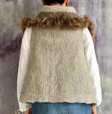 This fur trimmed vest is hand felted from natural colored Corriedale wool fiber and Romney fleece, offering both warmth and a refined rustic charm. The surface is intricately decorated with linen fiber, adding an elegant, textured finish that enhances its natural aesthetic.