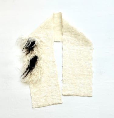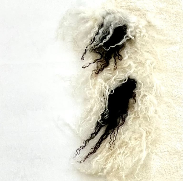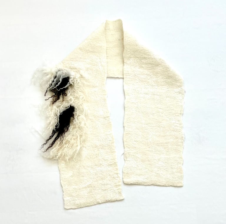 A meticulously hand felted shawl, crafted from the natural hues of premium wool fibers and fleece sourced from Falkland and Icelandic sheep. The rich texture and earthy tones reflect the purity of the materials, offering a timeless, elegant accessory that embodies both warmth and artistry.