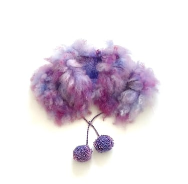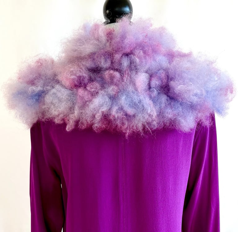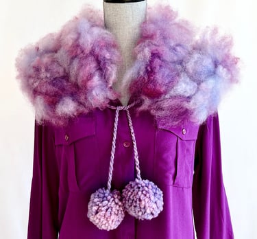 This luxurious fur collar is hand felted from a blend of Falkland wool and Romney fleece, both meticulously hand dyed to achieve a rich, vibrant hue. Adorned with playful, handmade pom poms, it makes a bold statement that effortlessly combines artisanal craftsmanship with whimsical charm. This fur collar is perfect for adding a touch of flair and sophistication to any outfit, transforming simple looks into eye-catching ensembles. Whether draped over a coat or layered with a sweater, this collar is an exquisite accessory that elevates your style while showcasing the beauty of handmade artistry.