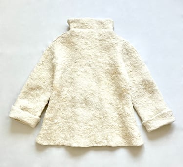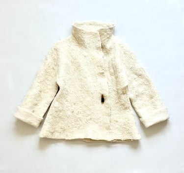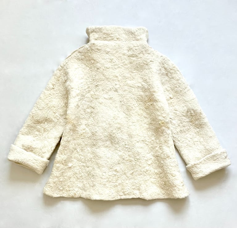 This beautifully hand felted coat is crafted from the natural white wool fibers and fleece of Merino and Romney sheep, offering both warmth and elegance. Lined with soft cotton fabric for comfort, the coat features a minimalist single button closure, blending rustic charm with refined simplicity. Its timeless design makes it a perfect companion for cozy retreats and everyday adventures alike.