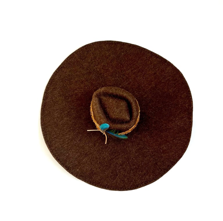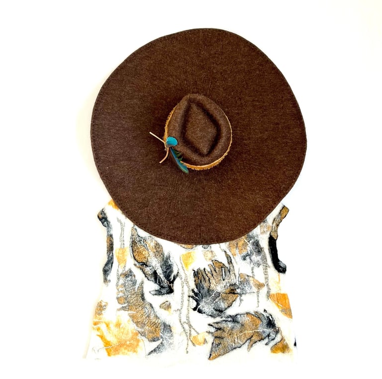 This 8-inch wide brim hat is hand felted from natural colored Merino crossbreed wool, combining elegance with practicality. The luxurious texture of the wool provides both warmth and breathability, making it an ideal accessory for various seasons. Adorned with a stylish cotton ribbon and rich leather accents, the hat exudes a rustic charm. The beautifully molted feathers add an artistic touch, creating a unique focal point that enhances its overall allure.