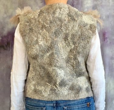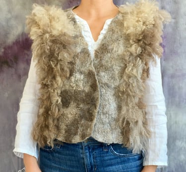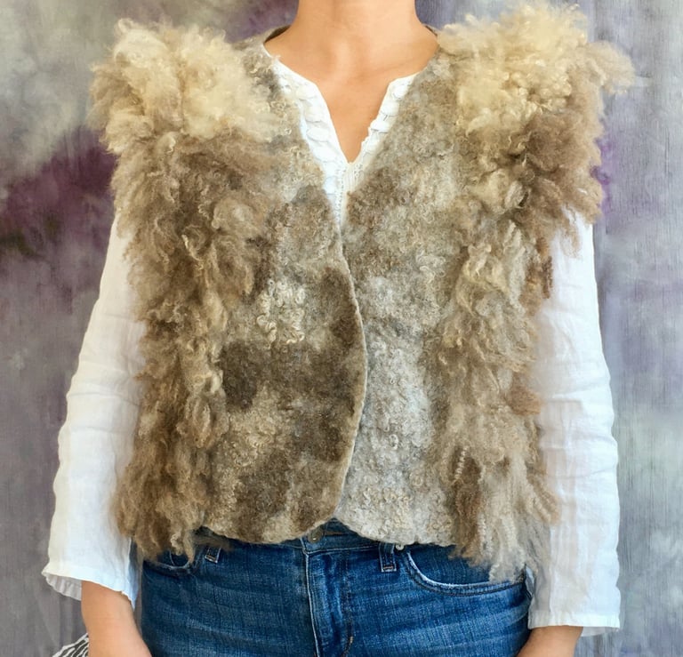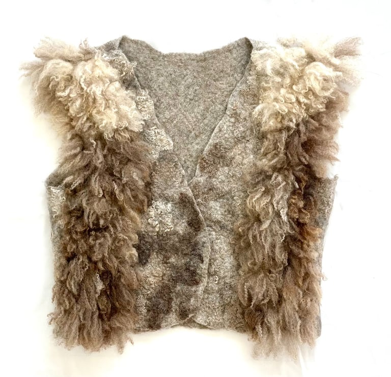This cropped vest is hand felted from natural colored wool sourced from Corriedale and Romney sheep, offering a luxurious blend of warmth and durability. The front features a sleek snap button closure, adding both functionality and minimalist charm. With its cropped silhouette and timeless design, this vest is a versatile piece that seamlessly combines modern style with the organic beauty of natural fibers, perfect for layering and everyday wear.
