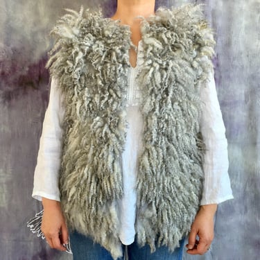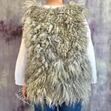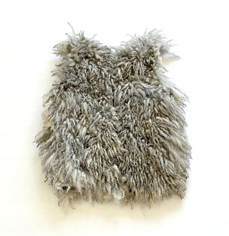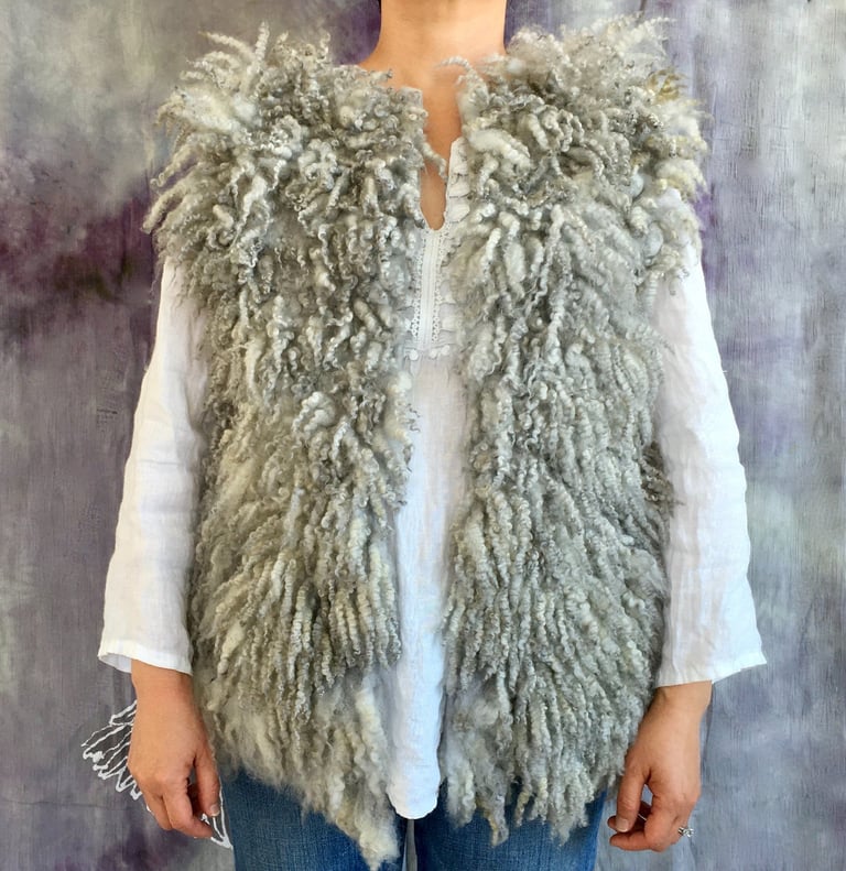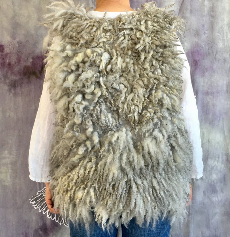 This fur vest is hand felted and hand dyed from the luxurious fleece of Shetland sheep, beautifully showcasing the natural characteristics of the fibers. Designed with an open front, it drapes effortlessly, offering a relaxed fit that is both stylish and versatile. The rich hues and soft texture evoke the serene colors of a stormy sky, making this vest the perfect layering piece for the colder seasons.