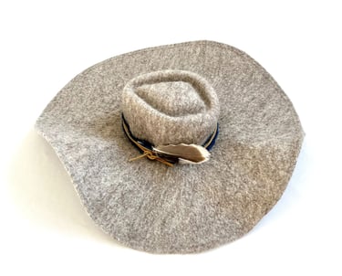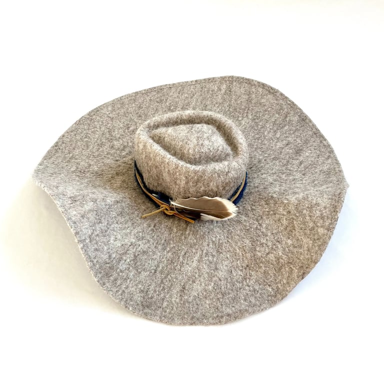 This hat is hand felted from natural colored Corriedale wool, showcasing a beautiful blend of warmth and texture. Adorned with molted feathers, rich leather accents, and a decorative ribbon, it exudes rustic elegance—perfect for those who embrace individuality and comfort.